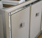 Reflect your love for contemporary style with this accent cabinet. It features a mirrored top and beveled mirror accents, adding both light and a touch of glam to your space. Decorated with faux crystal and chrome-tone pulls, the textured silvertone door fronts open to reveal adjustable shelving to meet all your storage needs.