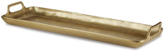 This tray was made for serving up superb style. Goldtone finished cast aluminum sets a sturdy foundation. This is the perfect fashionable piece for quickly adding versatility to your home.